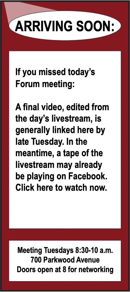 Click here to receive a Sunday e-mail that lists upcoming speakers and links to Forum website features.