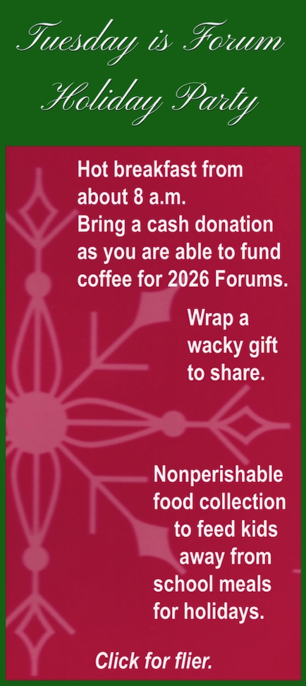 The Forum’s annual Holiday Party will be Dec. 16, complete with catered breakfast, song, games, gift exchange and an ingathering of cash donations to finance 2026 meetings.
