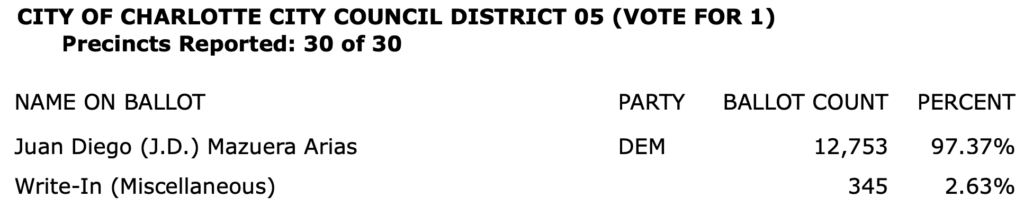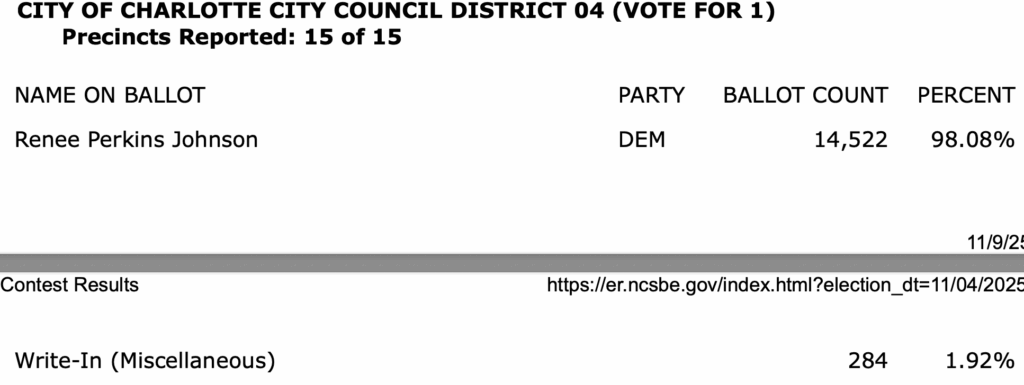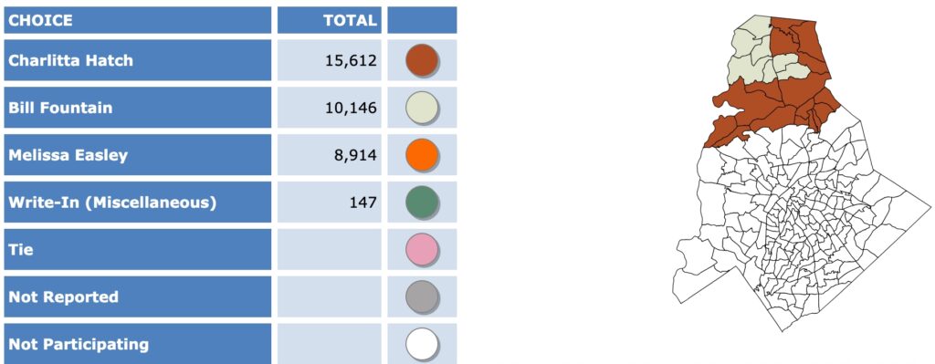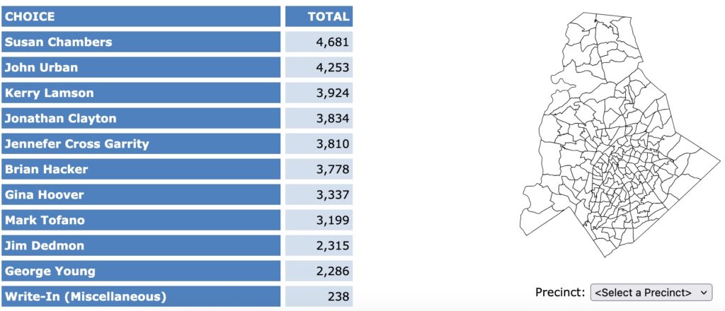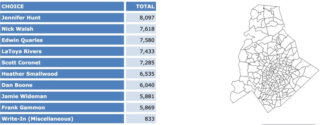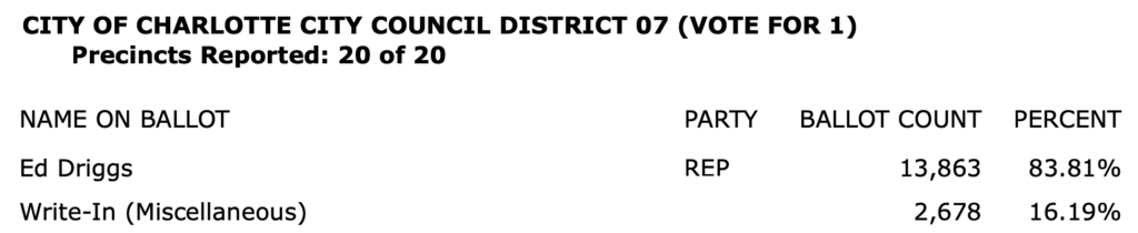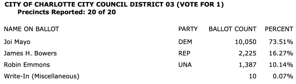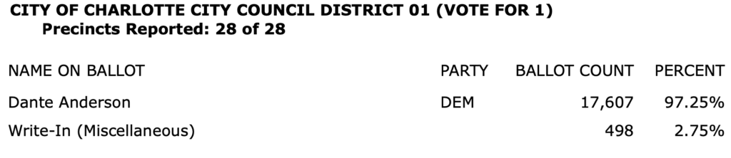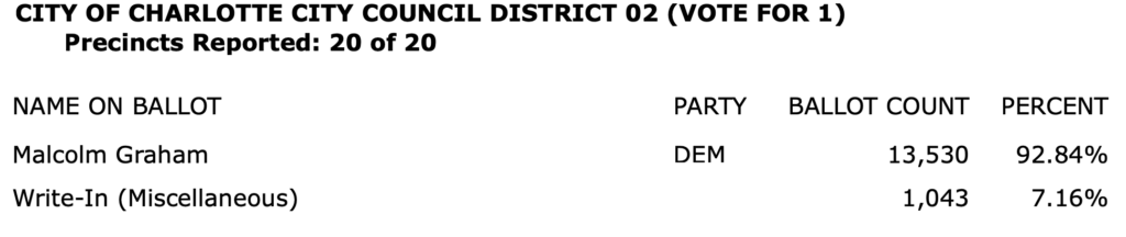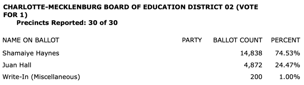 After all polls closed, unofficial Mecklenburg vote totals were available at the NC Board of Elections website here. This page is used chiefly to add election results to the Forum’s archive on individual candidates (e.g., Juanrique Hall) to inform future readers of this website.