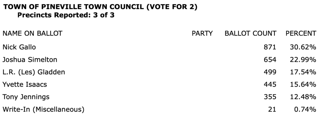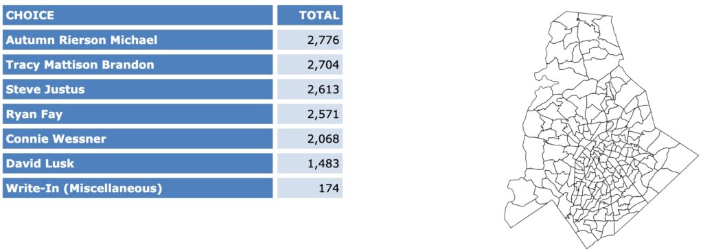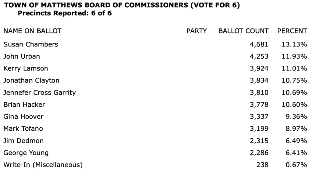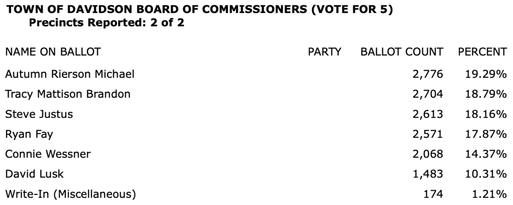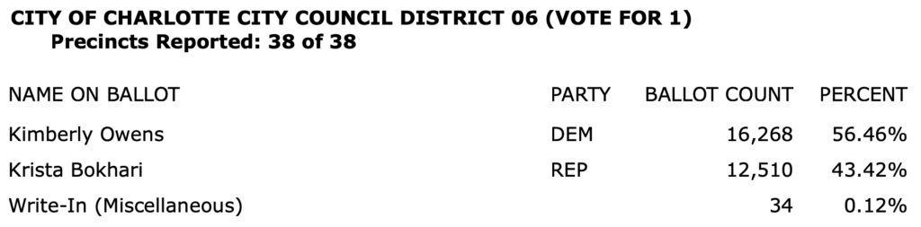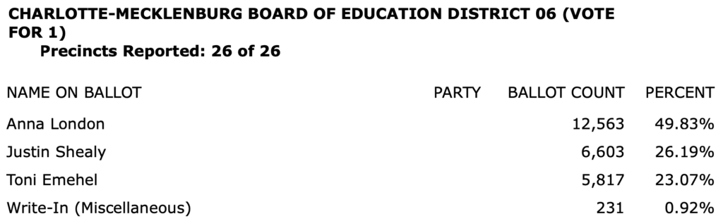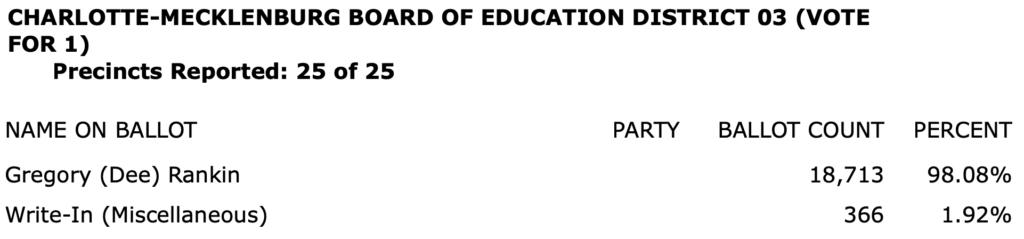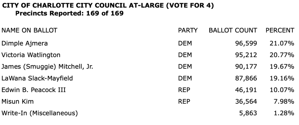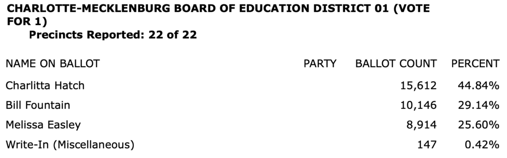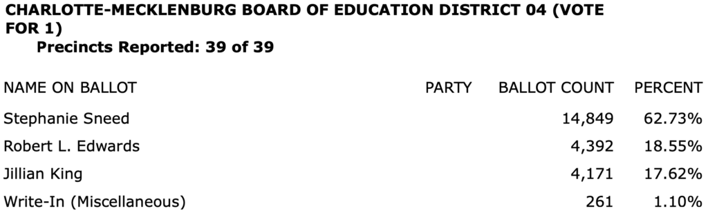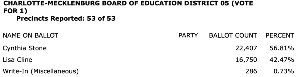 The full list of election results for Charlotte-Mecklenburg in an 8-page PDF is here.\