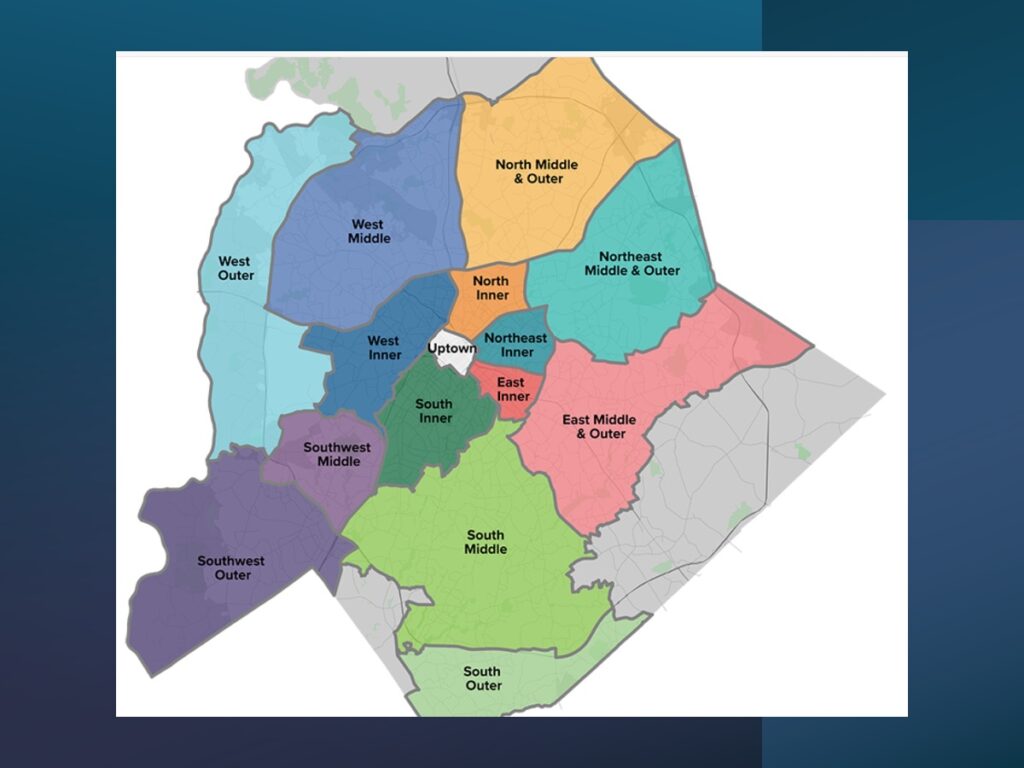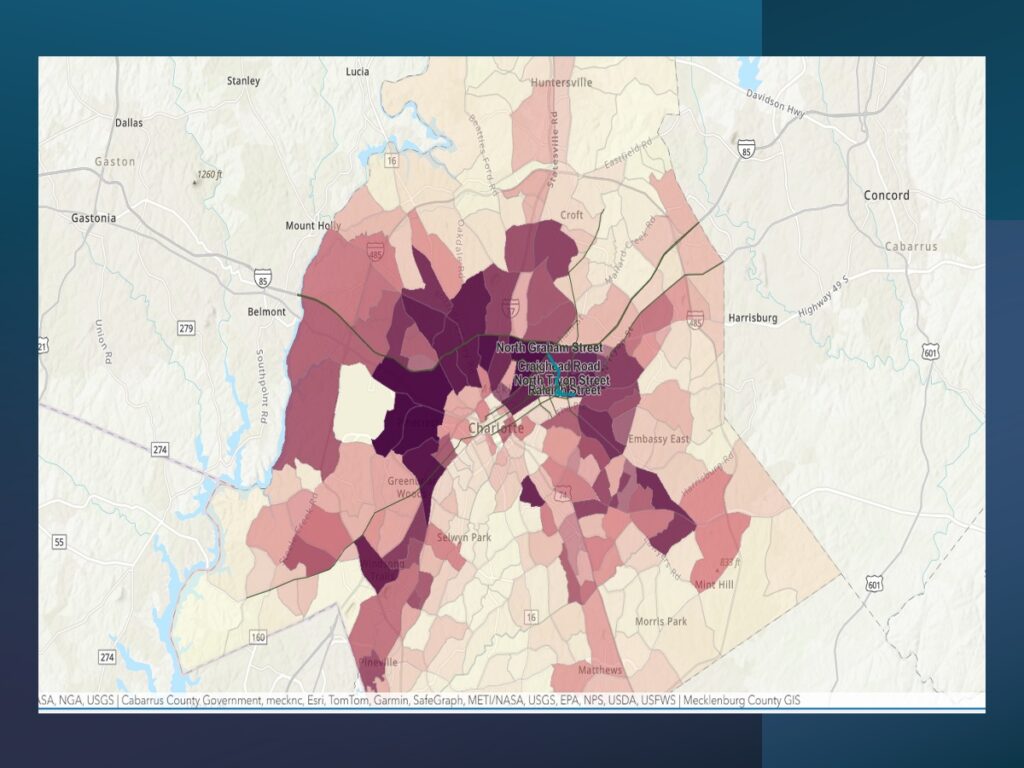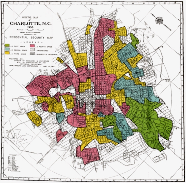 Drayton said many communities have sought changes and that planners have been responsive and those neighborhhoods are satisfied with the changes made. But she noted that overlaying the 1935 map at right of redlined neighborhoods on westside Charlotte on top of the new community plan maps shows evidence that a decades-old injustice is continuing.