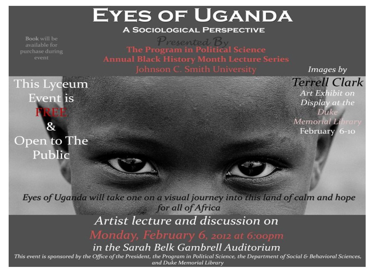 Nooma Monika Rhue sent in an announcement of a free Annual Black History Month Lecture on Eyes of Uganda, a sociological perspective, featuring images by Terrell Clark, an artist lecture and discussion on Monday, Feb. 6 at 6 p.m. at the Sara Belk Gambrell Auditorium on the J.C. Smith University campus, 100 Beatties Ford Rd. A flier is here.