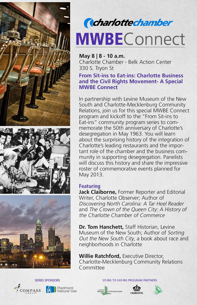 Felisha Fletcher sent in an announcement of a Charlotte Chamber event titled "From Sit-ins to Eat-ins: Charlotte Business and the Civil Rights Movement" on Wednesday, May 8 from 8-10 a.m. Reservations by e-mail. A flier with more details is here.