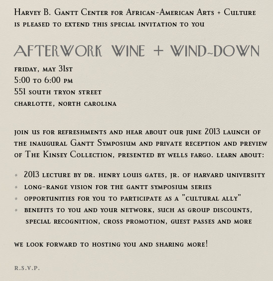 The Gantt Center sent in an invitation an "Afterwork Wine + Wind-down" at the Center on Friday, May 31 from 5-6 p.m. at 551 S. Tryon St., to "hear about our June 2013 launch of the inaugural Gantt Symposium and private reception and preview of The Kinsey Collection, presented by Wells Fargo." A palm card is here.