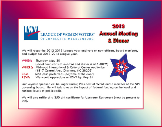 The League of Women Voters sent in a reminder of its 2013 Annual Meeting & Dinner at 5:30 p.m. on Thursday, May 30. Details here.