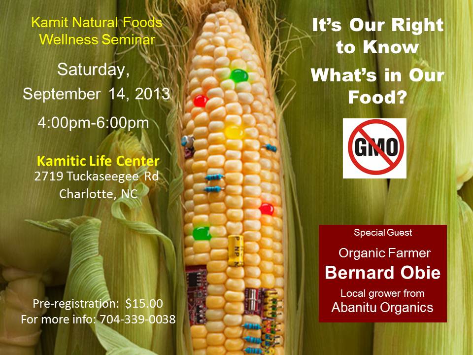 Noorma Monika Rhue sent in an announcement that Kamit Natural Foods will host Bernard Obie of Abanitu Organics speaking on geneticallly modified foods, on Saturday, Sept. 14 from 4-6 p.m. Pre-registration is $15. Details here.