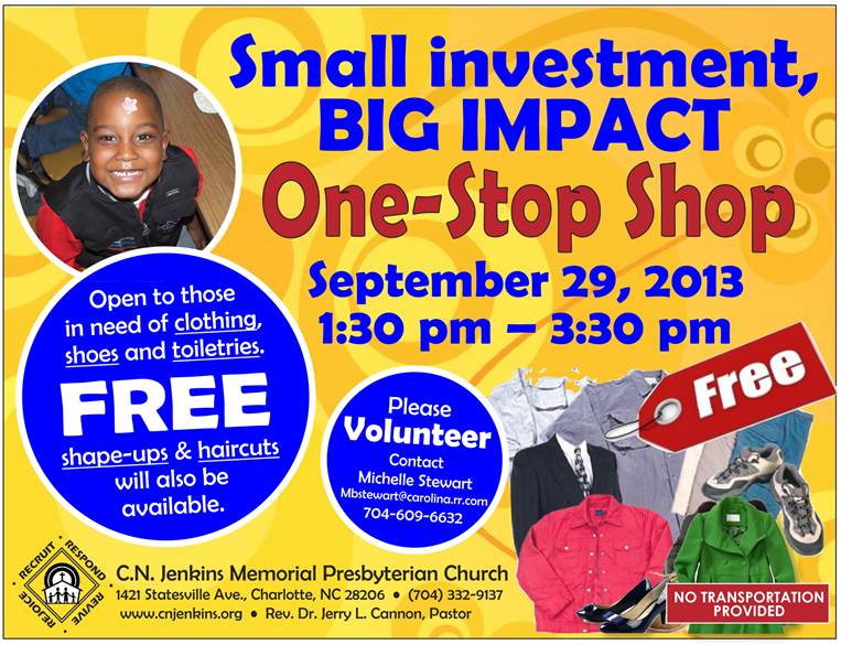 Colette Forrest sent in an announcement of the free One-Stop Shop open to those in need of clothing, shoes and toiletries on Sunday, Sept. 29, from 1:30-3:30 p.m. at C.N. Jenkins Memorial Presbyterian Church, 1421 Statesville Ave., with a request for volunteer help on Saturday.