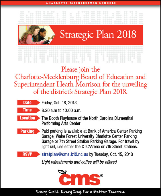 LaTarzja Henry sent in an invitation to attend the unveiling of the CMS Strategic Plan 2018 on Friday, Oct. 18 at 8:30 a.m at the Booth Playhouse in the Blumenthal Performing Arts Center. RSVP by Oct. 15 by e-mail. Free. Light refreshments and coffee served.