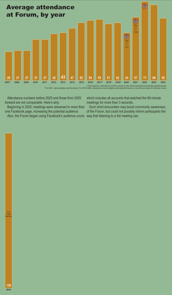 Near the close of the Forum, facilitators often call for Announcements. During this period, participants can stand and mention upcoming community events – which become part of the Forum’s next set of e-mailed announcements – or raise community issues they wish to bring before all participants. Details and supporting material about announced events may also be sent in at any time via e-mail. There is no charge to sponsoring organizations. “Upcoming events” focus on public policy topics of interest to Mecklenburg residents that are open to the public. Listings will include any known admission fee. Business and faith house promotions are generally not published. Sign up to receive free weekly e-mails here. An archive of announcements back to 2004 is here. To volunteer to continue this 21-year service to the larger community, e-mail Steve Johnston.